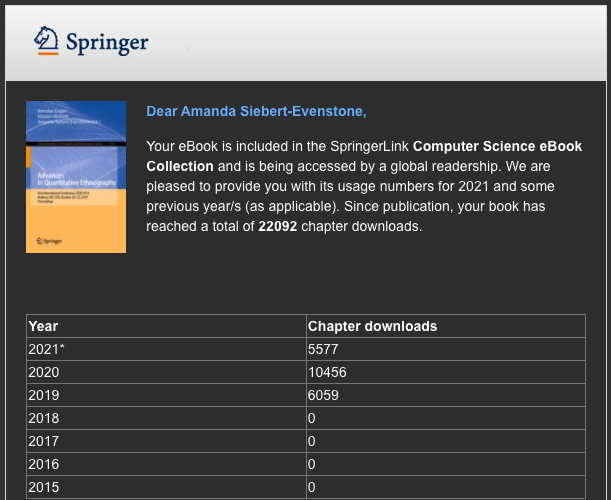 I am a quantitative ethnographer known for developing new methodologies and tools, finding patterns and qualitative stories that generalize within large datasets, and distilling complex ideas into coherent, engaging, and compelling articles and presentations. At heart, I love working on messy data and problem-solving ways to tell meaningful stories.